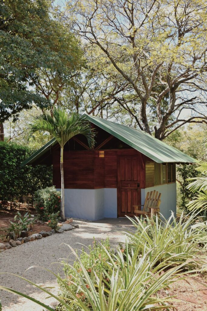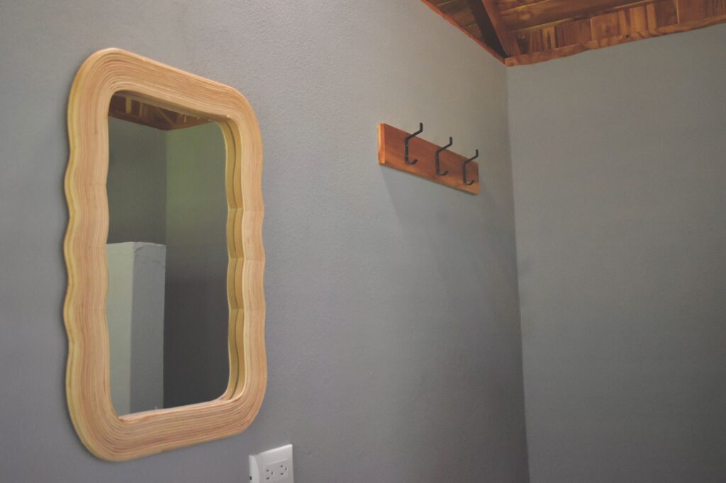 Fall asleep to sounds of the jungle in one of our open-air, screened in cabinas. Each cabina is lovingly constructed with reforested teak wood, and contains furnishings of the same. Each cabina includes two twin beds, a ceiling fan, safe, and wooden shelving storage space. Cabina guests use our community washroom facility which includes beautifully constructed stone showers (with hot water).