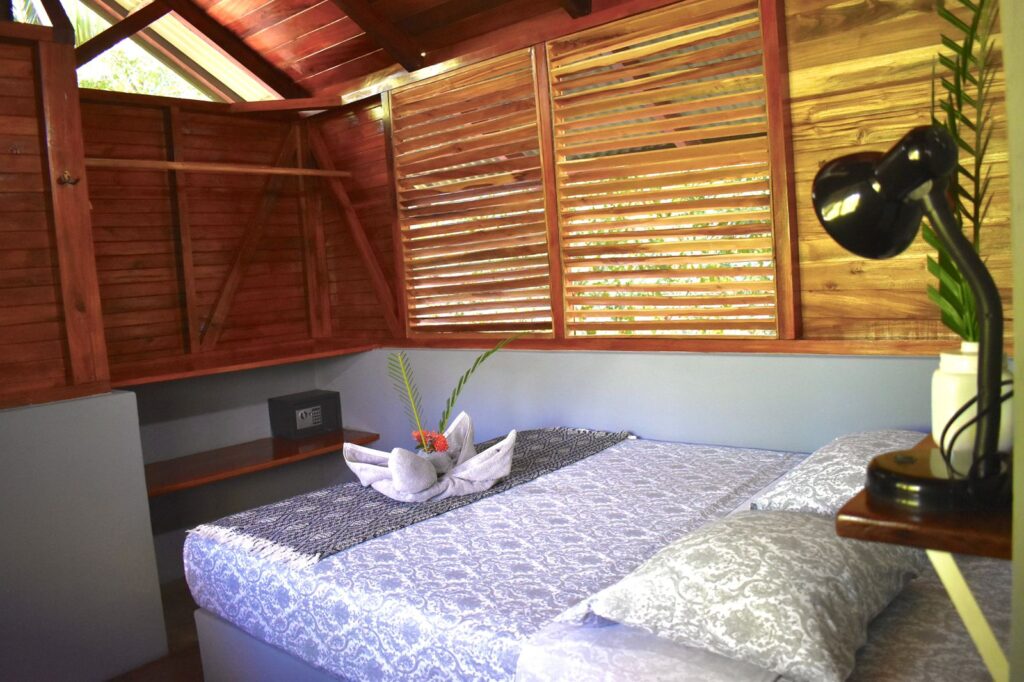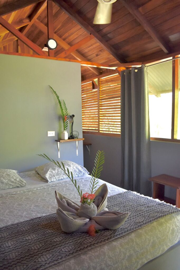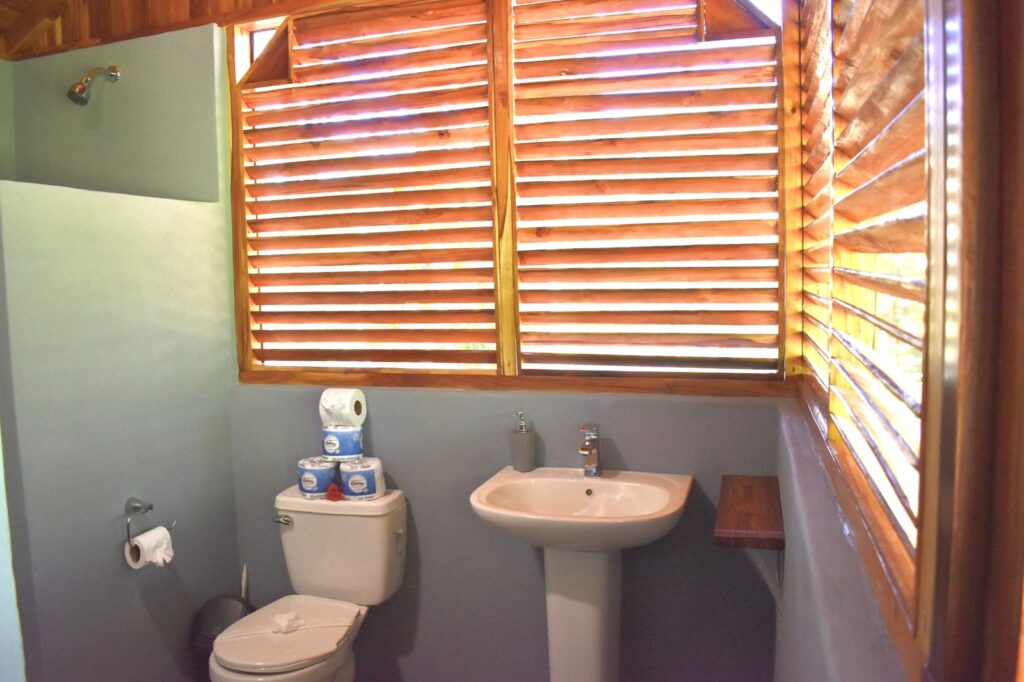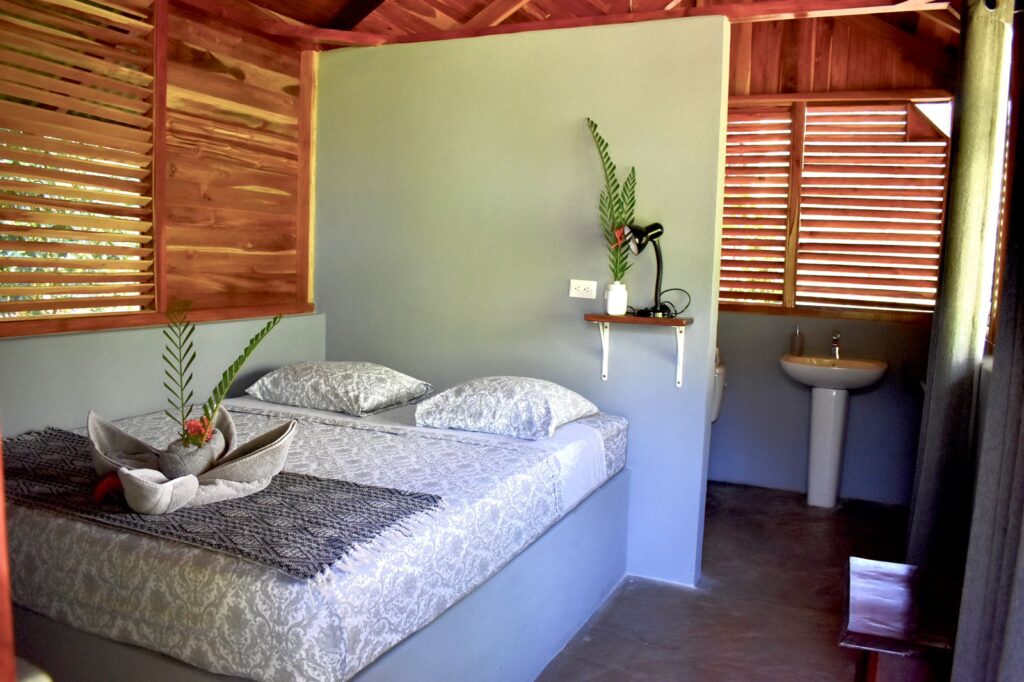 Fall asleep to sounds of the jungle in our deluxe, open-air, screened in cabina. This cabina is lovingly constructed with reforested teak wood and features a queen-size bed, private bathroom, ceiling fan, safe, and wooden shelving storage space.